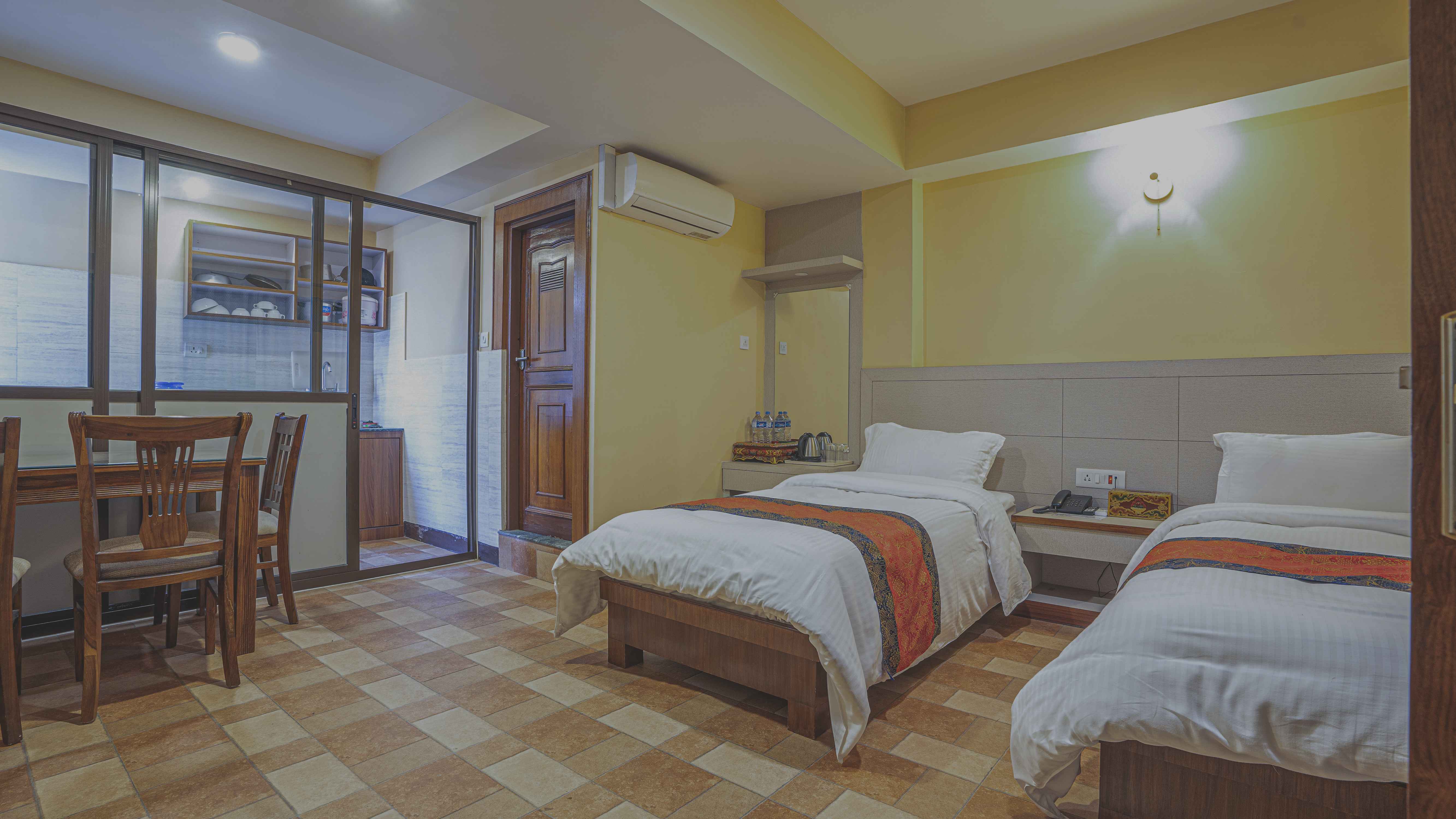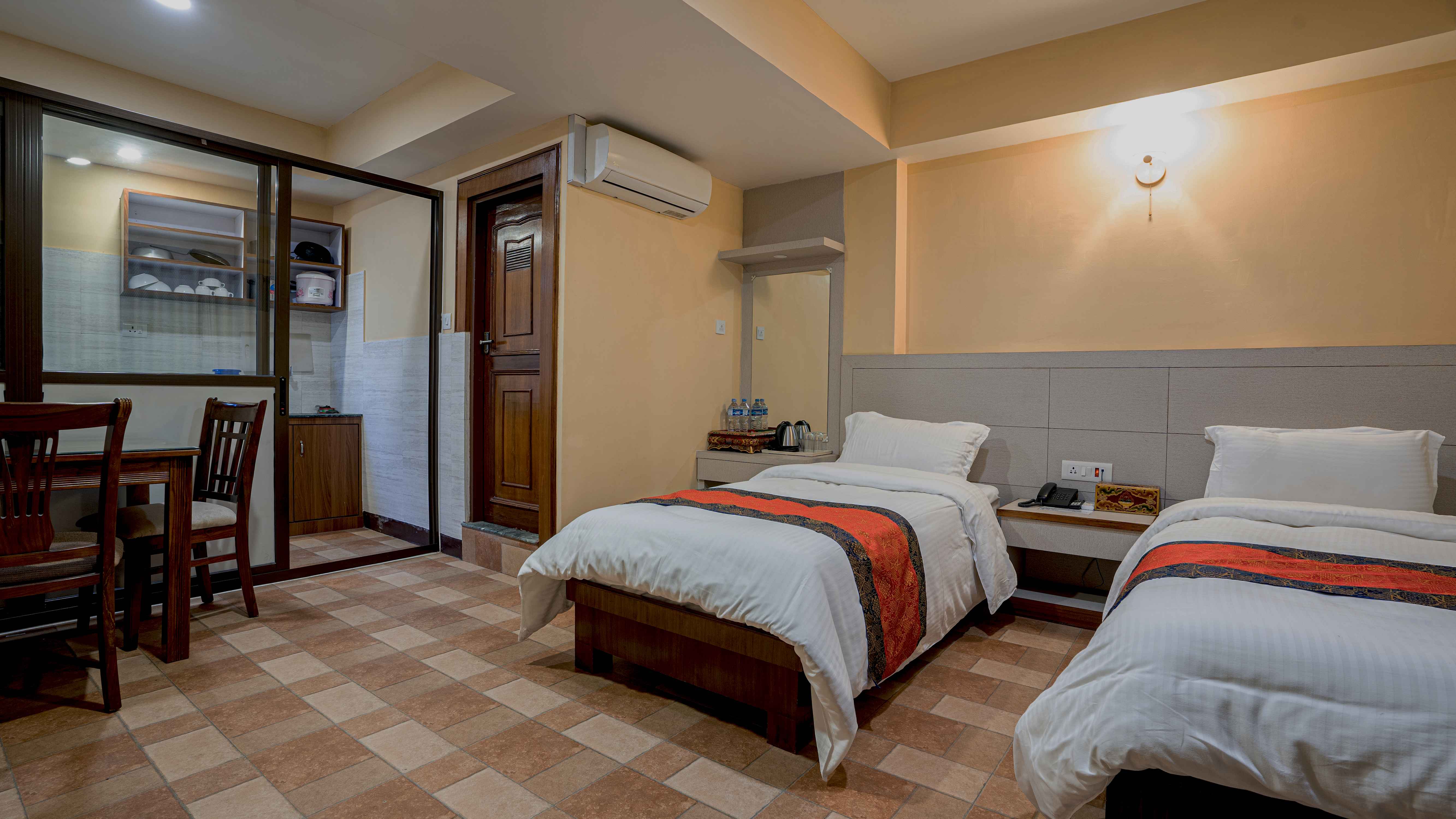 Discover comfort and versatility in our Studio Twin Room, a harmonious blend of modern design and functionality. Perfect for friends or family, this spacious room offers twin beds and a thoughtfully designed space to unwind. Immerse yourself in a cozy ambiance complemented by contemporary amenities, creating an ideal retreat after a day of exploration or business endeavors.